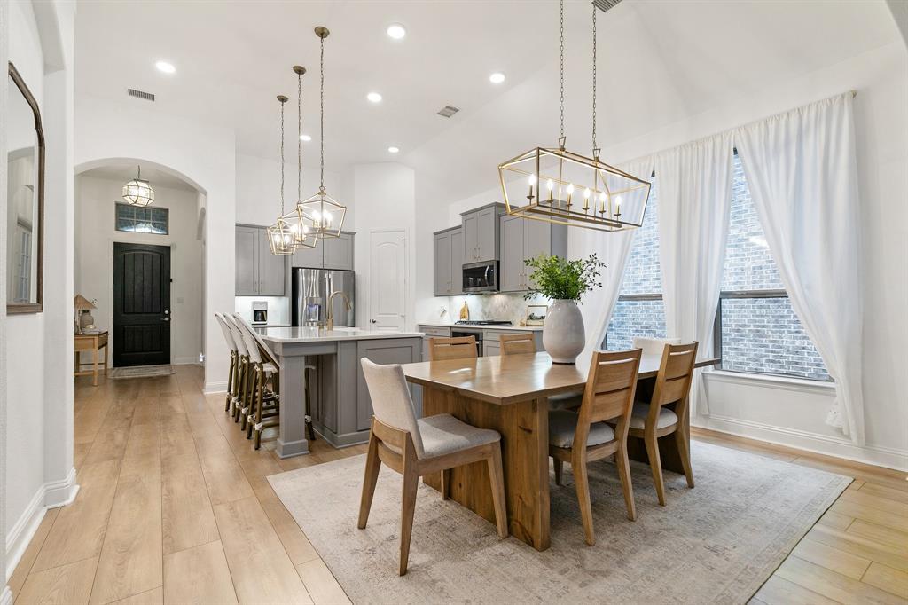 The main level showcases elegant wide plank white oak luxury vinyl flooring, setting the stage for a warm and modern aesthetic. The heart of the home is the chef-inspired kitchen, thoughtfully designed with an abundance of cabinetry, sleek stainless steel gas appliances, a farmhouse sink, quartz countertops, and designer lighting. It flows seamlessly into the dining and living areas, creating an open-concept layout that's ideal for both entertaining and everyday family life.