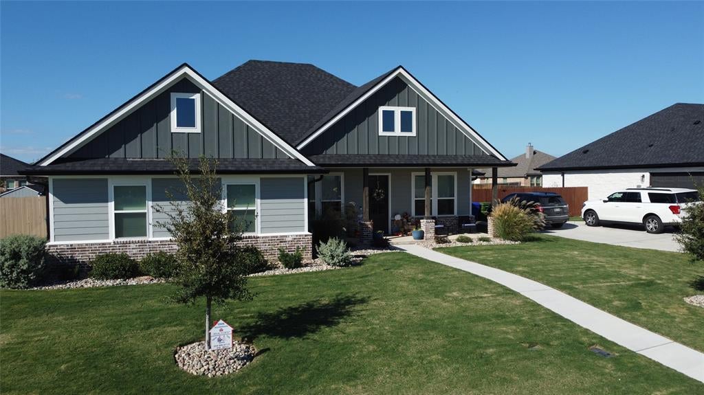 Discover the perfect blend of classic ranch charm and contemporary sophistication in this stunning 4 bedroom, 3 bath, 2224 square foot single-story residence, complete with a spacious country front porch. Generous windows invite an abundance of natural light into the open-concept layout, fostering a seamless flow between the living areas and a tranquil backyard retreat adorned with exquisite landscaping and palm trees, ideal for effortless indoor-outdoor living. Enjoy the distinctive heated and cooled Biodesign pool, featuring a spacious beach area with bubblers, creating your own private oasis. Evening swims are enhanced by an array of lighting options. The expansive covered back porch serves as an ideal spot for savoring your morning coffee. Inside, the electric fireplace provides warmth and an appealing ambiance. The large dining area accommodates family gatherings comfortably. The modern kitchen boasts stylish finishes, an exceptionally large island, a farmhouse sink, ample cabinetry, double ovens, and a generous pantry. Two bedrooms with spacious closets share a Jack and Jill bathroom, while an additional bedroom accesses the guest bathroom. The laundry room, featuring contemporary tile flooring, offers abundant storage and a folding countertop. The spacious main suite features a spa-like bathroom with a large soaking tub and shower that includes a seat and a stone floor for added luxury. With bottom-up, top-down blinds throughout, you can easily control the light entering this home, which is adorned with chic vinyl plank flooring. The garage has a non-slip epoxy floor. Thoughtful design elements enhance the entire home, creating a serene sanctuary in a highly sought-after location.