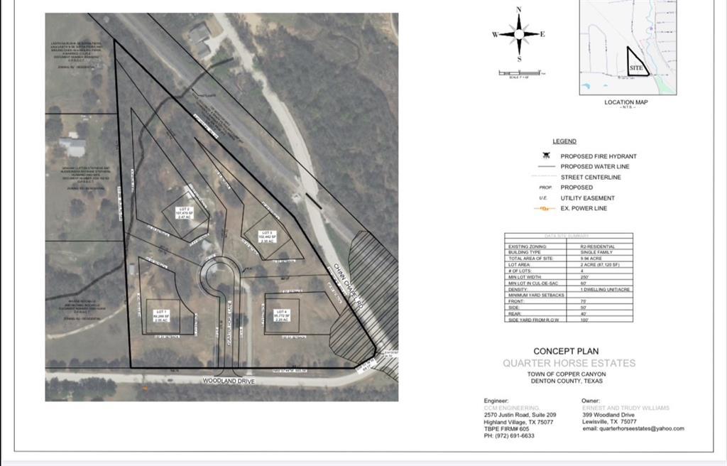 Welcome to a very rare and unique opportunity to invest and build on 4 lots that are 2+ acres each out of a 9.94 acre tract in prestigious and highly sought after, Copper Canyon, TX. This is a one of a kind luxurious property that has rolling hills, mature oak trees, lots of privacy, woods, a creek, and no HOA. The sky is the limit to what you can build on this rare jewel! All of the paperwork is done with engineer and we are at the final meetings with the city. We are looking to sell the project and someone can make a lot of money on it! We are pricing it to sell and are motivated to move it quickly. All offers will be considered!