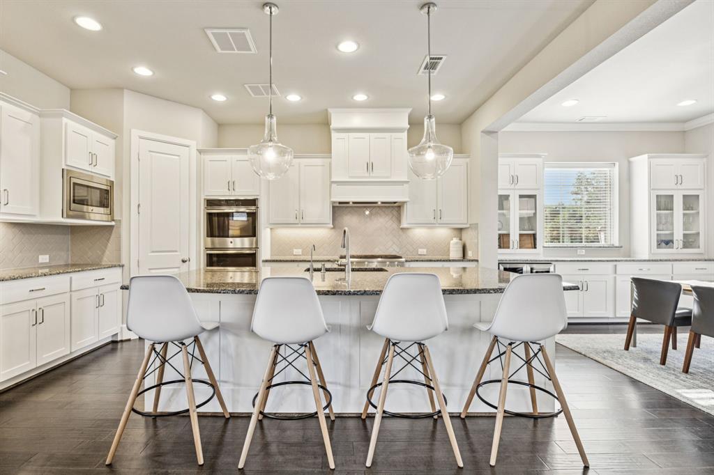 The chef-inspired kitchen boasts ceiling-height cabinetry, Monogram 6-burner gas cooktop, stainless steel appliances, walk-in pantry, and an oversized island perfect for gatherings. The dining area features extended built-ins with a beverage center and charming French doors that open to a front patio—ideal for morning coffee or evening wine.