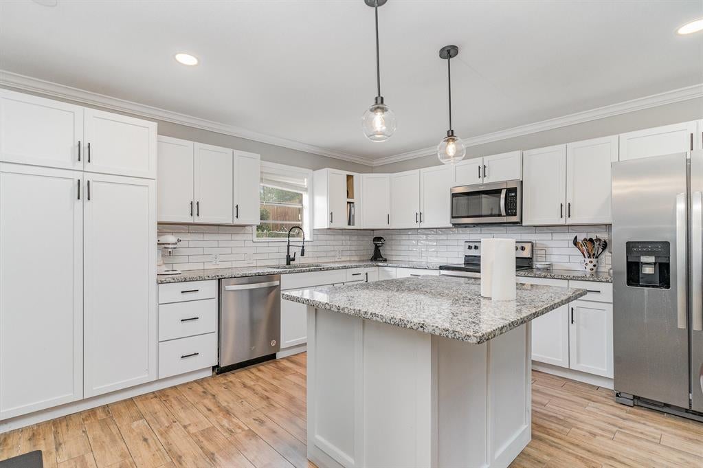 Perfect for first-time homebuyers or those looking to downsize! This charming and well-maintained 3-bedroom, 2-bath home sits on a generous .531-acre lot and offers an inviting open floor plan ideal for comfortable living and entertaining. Step into the cozy living room featuring a stunning full-wall brick wood-burning fireplace with a hearth and classic wood mantel, a perfect spot to gather with family and friends. The spacious kitchen boasts stylish white cabinetry, gleaming granite countertops, white tile backsplash, a large island with breakfast bar, and stainless-steel appliances, including electric cooktop, dishwasher, and built-in microwave. The kitchen flows seamlessly into the dedicated dining area and living room, making it great for hosting guests or holiday gatherings. The private primary suite includes a dual-sink vanity with granite countertops and its own ensuite bath. All three bedrooms are generously sized and feature ceiling fans for year-round comfort. Step outside to the huge backyard, where there’s plenty of open space to play, garden, or relax under mature shade trees. The patio is perfect for BBQs, evening hangouts, or weekend get-togethers, and there’s even a chicken coop for those wanting to enjoy a touch of country living. Additional highlights include updated roof (2021) and solar panels that will be paid off at closing, a major bonus for lowering electric bills and reducing your carbon footprint. Conveniently located close to schools, this home offers the perfect blend of charm, functionality, and outdoor living! Special financing offer on this home-reach out for more info.