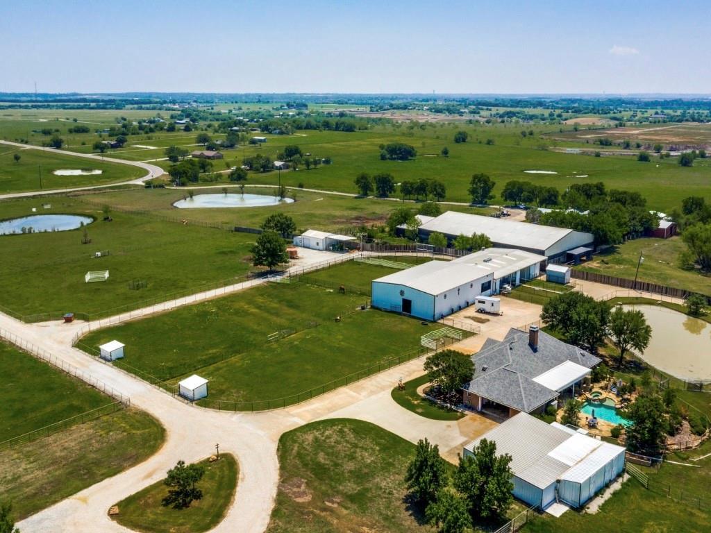 8 ACRES, House with horse barns and stalls, swimming pool, multiple car spaces, conveniently located close to DNT. Rare and incredible opportunity to live with your own horses! Features 4 BR, 3 BA, a sparkling pool, and large covered patio on over 8 acres. High coffered ceilings in the living room and 2 spacious dining areas. The property boasts an oversized 2-car garage and a 4-car carport with an attached 3-stall barn equipped with floor mats, Dutch doors and separate pasture. The property is set up for horses, featuring an 80' x 36' Barn with AC and Heat, washroom and 10 stalls with 8 dutch doors. The indoor arena is 81' x 50' with rollup doors, while the outdoor arena is equipped with a gate system, cow chutes, and lighting. No HOA and located outside city limits, yet just 1.5 miles to DNT. Additional 30' x 24' workshop with half bath, and a covered area for parking. Furniture in photo is not included.