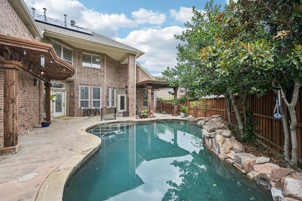 NEW CARPET & JUST REDUCED!!!This beautifully maintained 4-bedroom, 3.5-bath home nestled on a quiet cul-de-sac in the sought-after Northlake Woodlands East neighborhood. With over 3,500 square feet of thoughtfully designed living space, this home offers the perfect balance of comfort, functionality, and style. Step inside to discover an inviting open floor plan with vaulted ceilings and rich hardwood floors. The spacious living area features a cozy gas fireplace and flows seamlessly into a gourmet kitchen with granite countertops, a center island, pantry, and ample cabinetry—ideal for everyday living and entertaining. The expansive primary suite is a true retreat with a spa-inspired bathroom including a double vanity, large walk-in closet, and soaking tub. Additional highlights include a formal dining room, dedicated office, multiple living spaces, and generously sized secondary bedrooms. Outside, enjoy warm Texas days in the private backyard oasis featuring a sparkling in-ground pool with waterfall feature, covered patio, and beautifully landscaped yard with wood fencing for privacy. The 3-car rear-entry garage adds convenience and curb appeal with a custom tandem electric gate. This home offers a fully paid off solar panel system to save on your electric bill. Located in the acclaimed Coppell ISD, close to shops, restaurants, and major commuter routes, this home is a rare gem in a prime location. Don’t miss your opportunity—schedule your private tour today! Discounted rate options and no lender fee future refinancing may be available for qualified buyers of this home.