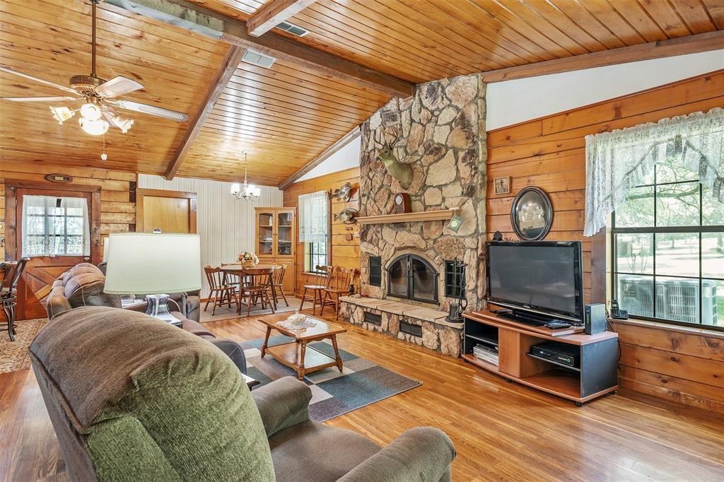 Your own piece of paradise awaits! This one-owner property offers tranquility among towering, majestic trees on a sprawling 0.77-acre lot with full irrigation from a lake pump system. Enjoy lake life with your private boat dock, perfect for relaxing or fishing just steps from home. The main house features a gorgeous fireplace with forced heat, designed to warm the entire home through the vents in addition to the HVAC system (2016, serviced annually). The roof was replaced 6 years ago, including the roof on the detached garage. The foundation was repaired in 2023 and comes with a fully transferable warranty for peace of mind. The property offers incredible versatility with a detached garage including a small office, a detached workshop with electrical, and a detached storage building, ideal for hobbies, projects, or extra storage needs. Inside, enjoy a new oven and microwave, and the refrigerator, washer, and dryer all convey with the sale. There’s even a small cedar space in the attic, perfect for storing seasonal items or keeping valuables safe. Plumbing includes BBC copper for all water supply lines and two 500-gallon septic system tanks. A new survey has been completed for your convenience. This property provides the perfect blend of natural beauty, functionality, and privacy. Don’t miss this rare opportunity to own a well-maintained home with so much to offer. Experience the serenity and make it yours!