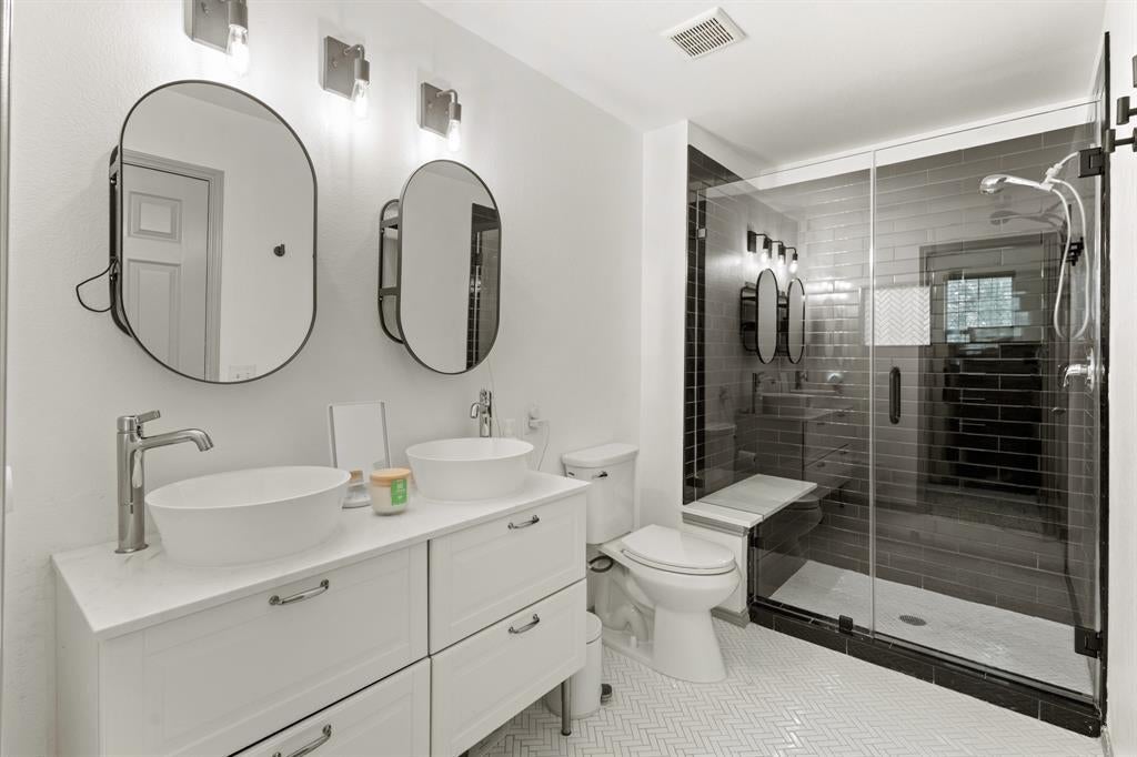 The primary suite is a true retreat with a large walk-in closet and a fully remodeled en-suite featuring dual vanities and a luxurious shower. All bathrooms have been upgraded with new vanities, mirrors, lighting, tile, faucets, and toilets; giving the home a fresh, move-in-ready feel.