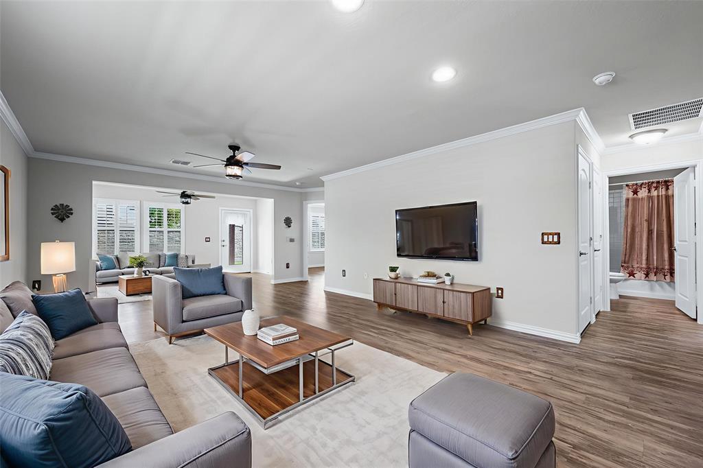 This is the home you have been waiting for! Pristine, move-in ready! This well-loved and well maintained 2-bedroom, 2-bath home boasts a light-filled open plan design perfect for hosting friends and family. The home is well-appointed with elegant, low-maintenance luxury vinyl plank through-out, plantation shutters through-out, granite countertops, and upgraded appliances - washer, dryer and refrigerator are INCLUDED. The primary bath offers a barrier-free tiled shower, dual sinks, granite counter tops and a spacious walk-in closet. Outside, the custom covered patio and private backyard is perfect for enjoying morning coffee or gathering with neighbors. Make this fabulous home yours and enjoy the lifestyle you have been looking for just steps outside of your door with outstanding amenity centers, resort-style pools, fitness facilities, numerous clubs, ponds, walking trails, pickleball and bocce ball courts, fishing, disk golf, and a full-time lifestyle director for planned events.