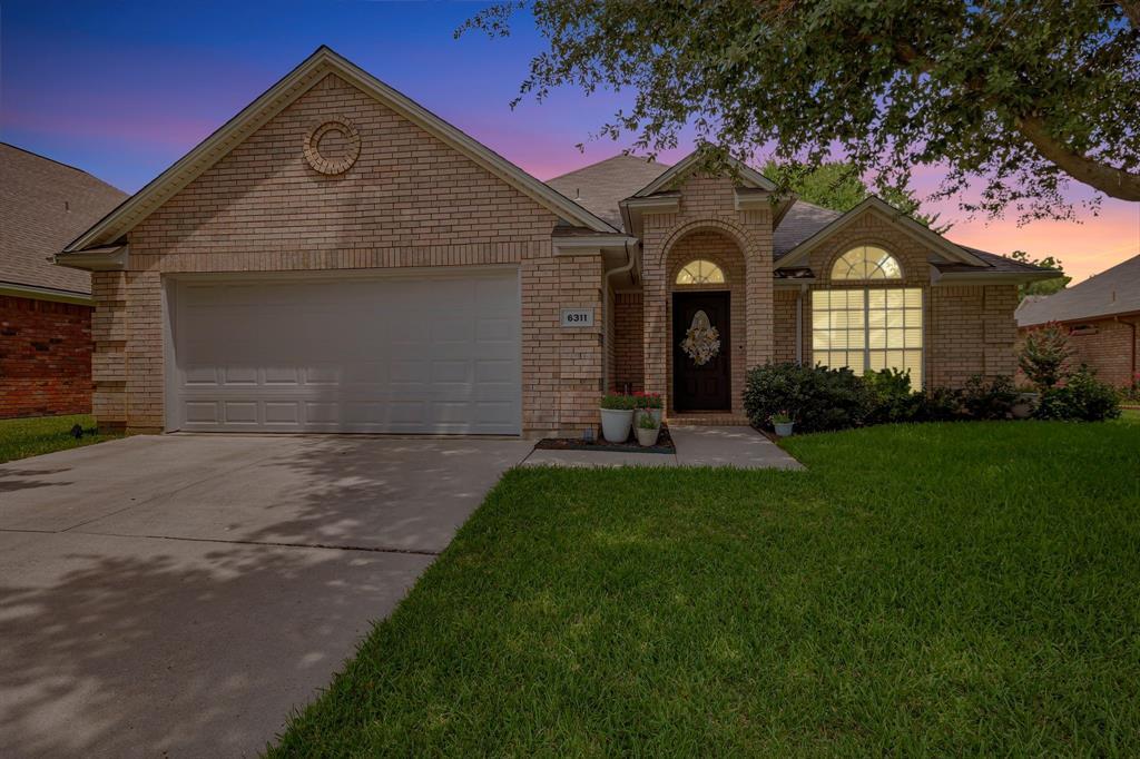 Move-in ready! One-story, all brick home in South Arlington's Fannin Farms development with award winning Mansfield Schools 2171 SF living area and 7201 SF lot. Nine-foot ceilings throughout. Two living and two dining areas. Family room with gas fireplace. Large primary bedroom with walk-in closet, ensuite bath with separate shower, soaking tub and commode room with door. Split floor plan with two additional bedrooms both with walk in closets. Beautifully updated with neutral decor including fresh paint, LV flooring, ceramic tile, porcelain tile, light fixtures, sod, and updated landscaping. Kitchen updates include freshly painted white kitchen cabinets, granite countertops, dark brown granite sink, newer convection oven, microwave (2025), dishwasher (2024), 5 burner gas cooktop, exhaust fan, fixtures, and ceramic tile flooring. Kitchen includes a skylight and a breakfast bar. Updated bathrooms with new granite countertops, sinks, lighting, mirrors, porcelain tile floors, comfort height toilets, and fixtures. Laundry room with porcelain tile flooring. All mechanicals serviced including sprinkler system with new water heater (2023). Deck freshly stained (2025). New Nest 4th gen smart thermostat. Beautifully treed yard with shaded rear deck. Small covered rear patio. Large, newly painted garage with built-in shelving. Enjoy beautiful community pool, basketball courts and walking trails. Two-year home warranty included.