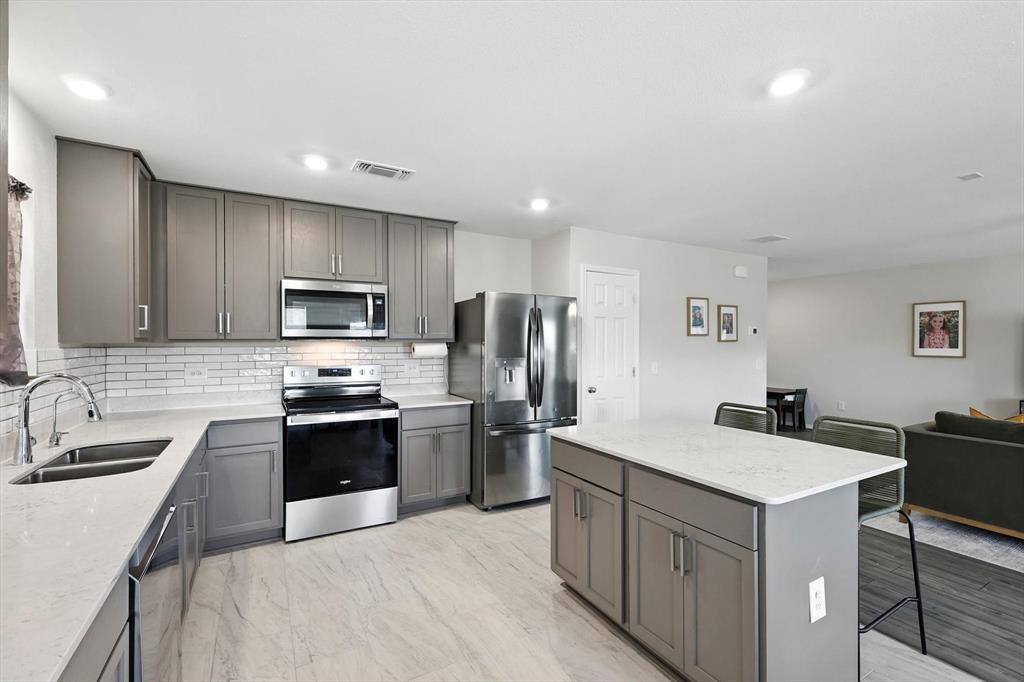Priced among the lowest per square foot in the area. Home has no carpeting and updated flooring. This lovingly maintained 4-bedroom, 3-bath home was thoughtfully designed for the way families actually live. The light-filled floor plan flows seamlessly from the heart of the home—the modern kitchen—to the spacious living areas, creating the perfect backdrop for everything from cozy weeknight dinners to lively gatherings. The upgraded cabinetry, sleek granite counters, stainless steel appliances, and oversized island with seating make cooking, snacking, and catching up effortless. No carpet means no stress—only easy-care wood, luxury plank vinyl, and tile flooring throughout. A downstairs bedroom with a full bath is the perfect space for overnight guests, a live-in parent, or a private office retreat. Upstairs, a second living area invites endless possibilities—a game room for the kids, a movie space, or simply a quiet spot to unwind. The primary suite is a true haven, offering peaceful greenbelt views, dual sinks, a walk-in shower, and a spacious closet. Two additional bedrooms and another full bath round out the upper level. Out back, your large semi-private yard is ready for laughter-filled play dates, garden dreams, or summer evenings under the stars. With a full sprinkler system, keeping it lush and inviting is practically effortless. Healthy-home upgrades like a whole-home air filtration system and reverse osmosis drinking water add peace of mind, while recessed lighting, modern fixtures, and ceiling fans create style + comfort in every room. When ready to get out and explore—just a half-mile away awaits a beautiful 24-acre park with trails, playgrounds, and a serene pond. Van Alstyne is more than a place to live—it’s a community with top-rated schools, a charming library, and activities for every stage of life. We live here, too—and can’t wait to show you around. Be sure to check out the 3D tour.