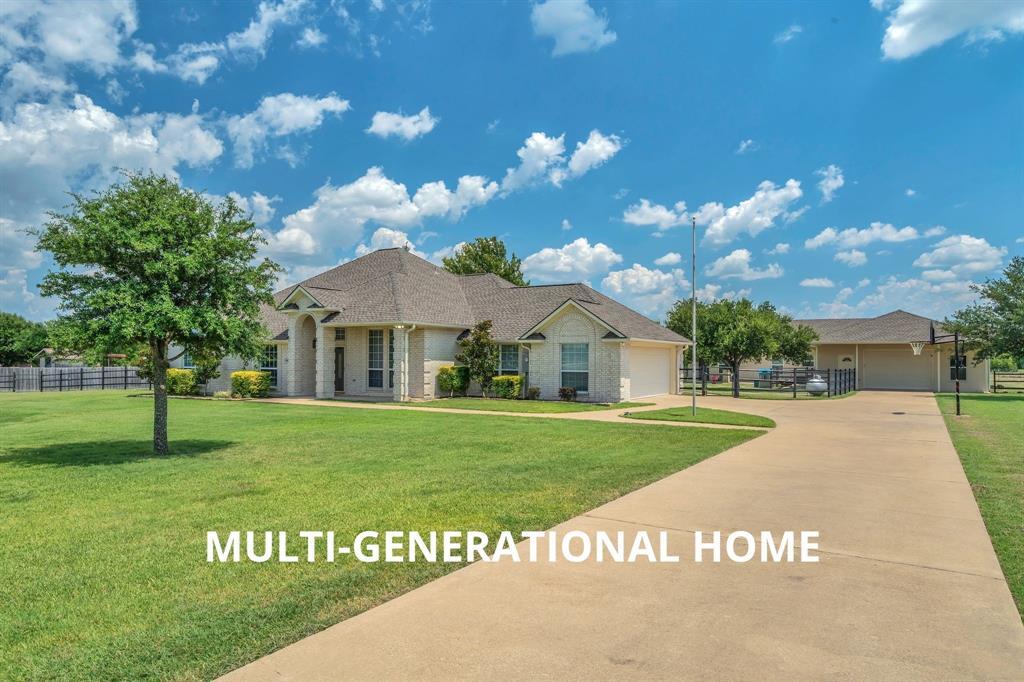 Multigenerational property on 2.5 acres offering two homes with no HOA. The primary residence features an open floor plan vaulted ceilings and tons of natural light. A formal dining room welcomes you upon entry. The family room offers a wall of windows overlooking the backyard, built-in storage, and a ceiling fan. The kitchen includes a breakfast bar, granite countertops, generous cabinetry, and walk-in pantry, and breakfast area. Split-bedroom layout ensures privacy for the primary suite with a bank of large windows overlooking the backyard, vaulted ceilings, and ensuite bath with dual sinks, vanity, jetted tub, separate shower, and oversized walk-in closet with built-in dressers. Guest bedrooms are near the full guest bath at the front of the home. A cedar-covered patio overlooks the backyard with firepit and stone walkway leading to the guest quarters. The guest home includes an open living area with kitchen, island, wine fridge, granite countertops, and abundant storage. The primary bedroom offers space for a sitting area, and a large walk-in closet with a sink. Additional bedroom includes its own closet with access to the bathroom; the bathroom features dual sinks. storage in the vanity and walk-in shower. Utility room with sink, cabinets, and space for extra refrigerator or freezer completes this versatile space—ideal for extended family, college students, or guests. In guest quarters garage there is a storm shelter. Centrally located near restaurants, shopping, and minutes from Rockwall, Forney, and Terrell. Generac generator operates both homes and conveys with the property - propane tank is used only for generator. Total approximate square footage includes both houses. Guest house (2037 sq. ft) and Main House (2054 sq ft)
