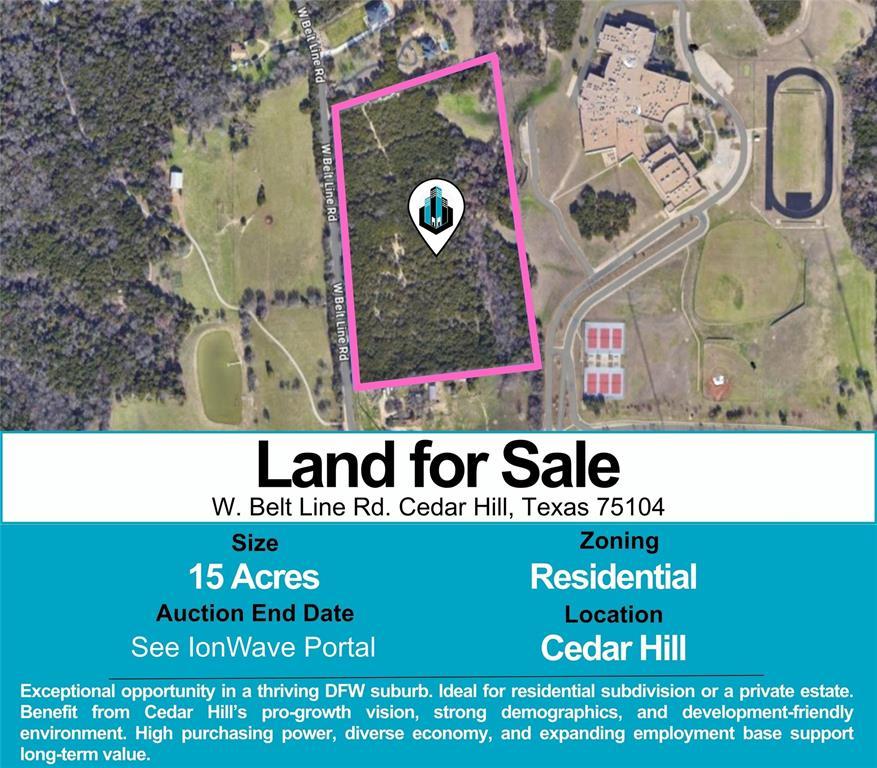 *** SEALED BID PROCESS*** Pursuant to § 272.001(a) of the Texas Local Government Code, Cedar Hill Independent School District, a political subdivision of the State of Texas (hereafter Seller) provides the public notice of the sale of real property and invitation to bid on real property owned by the Seller, Sale of Real Property, RFP 24-25-016. *** DESCRIPTION: Property is located on the western border of the Cedar Hill Collegiate High School along Northbound W. Belt Line Rd. The property will be parceled out of a larger parcel (DCAD #160126300A0010000) for a total site area of 15AC*. Property shall not include any personal property not permanently affixed to the land. *** Minimum Bid: $120,000 *** Seller reserves the right to accept or reject any or all bids as Seller may decide or as provided by the Texas Government Code. Seller reserves the right to extend the deadline or cancel the sale of real property at any time. *** See Attached files for additional information *** * Platting and parcel work will be completed prior to closing. ** Boundaries in images are approximate. Final boundaries will be provided with new survey