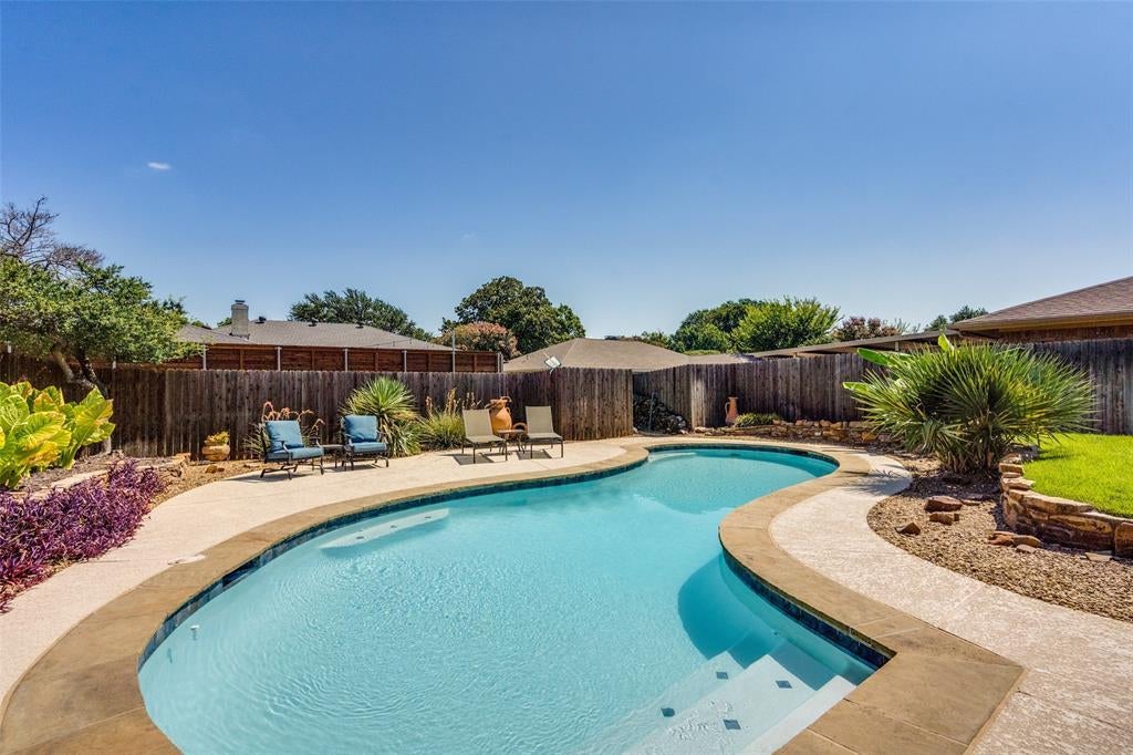 This charming single-story home located in West Plano features 4 bedrooms, 2.5 baths, on an oversized lot with mature trees. A desirable split bedroom floor plan is ideal with a secluded primary suite large enough for a small sitting area. The three additional bedrooms are enhanced with fresh new carpeting. The updated kitchen offers beautiful backsplash, double ovens, electric cook-top, nice cabinetry and custom pantry, and breakfast nook looking out to the pool. The main living area presents vaulted ceilings capturing natural light through the skylight. In the winter months cozy up to the artful arched fireplace. Summer is here to enjoy the oversized resort-style pool with a beautifully landscaped backyard. Conveniently positioned near PGBT, Legacy West, The Shops at Willow Bend and restaurants and local business.