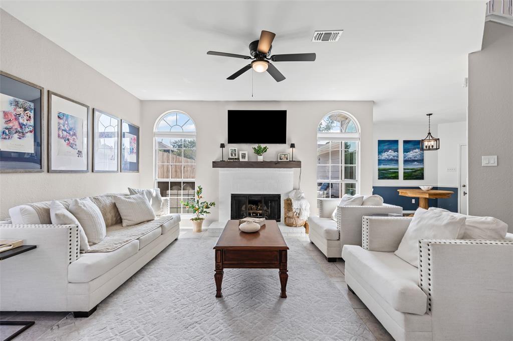 Enter through a dramatic two-story foyer leading to a private study with French doors, perfect for remote work or a quiet retreat. The open floor plan is filled with natural light and highlights updated fixtures, a bright kitchen with stainless appliances, quartz countertops, and a white tile backsplash. Entertain easily in the flowing living and dining areas designed for comfort and style.