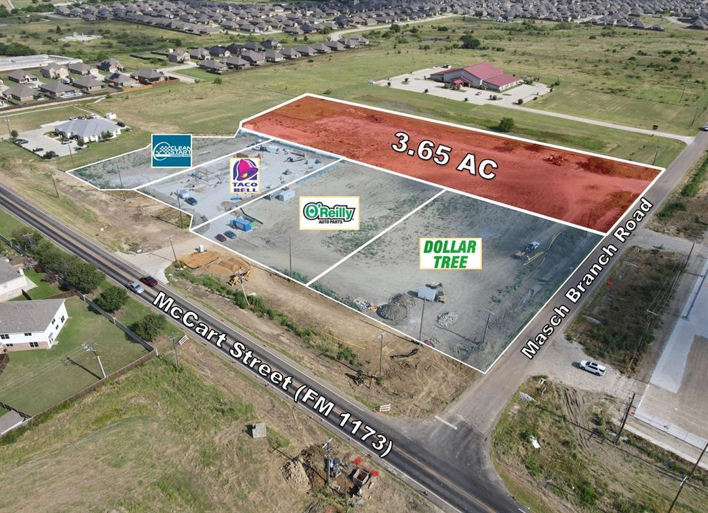 Commercially zoned and platted lot on NWQ of FM 1173 & Masch Branch Rd in Krum, located directly behind brand new retailers Taco Bell, O'Reilly Auto Parts, and Dollar Tree which are currently under construction. All utilities are to the site and the lot will be delivered with detention in place, using about 16% of the site. Great location for multifamily, flex-industrial, or office-medical developments.
