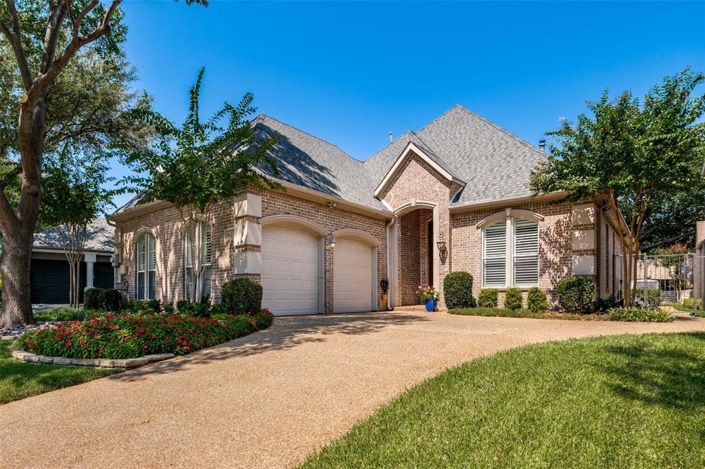 Pristine One Story in Plano’s Gated Greens of Gleneagles. This custom Goodman Built is well appointed through out with Hardwood floors, high ceilings detailed with crown molding and baseboards. A commanding front door leads to this open-concept living, dining and kitchen- perfect for entertaining. Inviting Living room, is perfect for multiple gatherings. It boasts a mantled stone fireplace, high ceilings, rich hardwood floors and tall windows overlooking the outdoor patio with well manicured greenspace. The Chef’s Kitchen is light and bright with white cabinetry and plenty of countertop space including a central island and expansive breakfast bar. The Primary retreat is private and located in the back. Spacious with tray ceiling sitting area. The spa-like bathroom has dual vanities, romantic corner garden tub and separate shower. A must see walk-in closet with a middle peninsula section and built-in drawers. ROOF 2016- This lock-and-leave pied-à-terre is situated in one of the most prestigious neighborhoods surrounding Gleneagles Country Club. Front yard maintenance is included in the HOA dues, in addition to the community brick fences, gate house and common areas ~ ensuring the lock & leave lifestyle.
