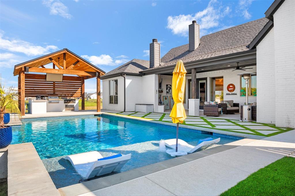 Welcome to 731 Red Tail Rd, a showpiece Canyon Creek Custom Home in the prestigious Eyrie Meadows community, zoned to Maypearl ISD with no city taxes. Perfectly situated next to 2.5 acres of open space and backing to farmland with unobstructed sunset views, this property offers privacy, luxury, and an entertainer’s dream backyard. Inside, enjoy a light-filled, open-concept floor plan with vaulted ceilings in the living room and master suite, hardwood floors throughout main spaces, and a striking German-smear indoor fireplace reaching to the ceiling. The gourmet kitchen features a gas cooktop, high-end granite countertops, and custom cabinetry — a true chef’s workspace. The primary suite includes a walk-in double shower, split vanities with premium granite, and a spacious walk-in closet. Three additional bedrooms feature high-grade carpet, including a Jack & Jill bath with granite and a guest bedroom with private half bath. Step outside to resort-style living: a heated & chilled pool with tanning ledge, a 250 sq ft covered back porch with spray decking, and a wood-burning outdoor fireplace. The outdoor kitchen and entertainment space are unparalleled — complete with pizza oven, Blackstone grill, and a RecTeq BBQ smoker. There’s even an outdoor pad ready for a shower, perfect for pool days. Hot tub will convey with acceptable offer! With a huge front porch, putting green, professional landscaping, and only one side neighbor, this property represents one of the finest homes in Maypearl.